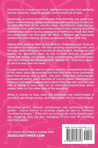 Get ready to fall head over heels into a world of romance, magic, and unforgettable characters. Best-selling author Jessica Sitomer is thrilled to introduce her highly anticipated new novel, Chemistry, a refreshingly witty blend of romantic comedy, fantasy, and self-discovery. With a backdrop that shifts seamlessly between the mystical realms of Eternity and the vibrant streets of New York City, Chemistry is a tale that dares to ask: what happens when love, destiny, and a little bit of magic collide? Chemistry follows the story of an immortal matchmaker who, after centuries of orchestrating human relationships with scientific precision, gets a little taste of her own medicine. Enter Matt, a charismatic yet overworked chef on the brink of culinary greatness, and the result is a romance as unpredictable as it is delightful. With its sharp humor, heartwarming moments, and a fresh twist on the timeless theme of love, Chemistry is the ultimate feel-good escape this holiday season. "Overflowing with charm, wit, and cosmic twists, Chemistry is more than just a love story-it's a reminder that even the most ancient beings can still learn a thing or two about the heart," says Sitomer. "Prepare to laugh, swoon, and maybe shed a tear as you're whisked away on this enchanting journey." Jessica Sitomer's knack for blending humor with heartfelt emotion shines through in this whimsical, deeply relatable story that will resonate with fans of Sophie Kinsella, Cecelia Ahern, and anyone who enjoys a touch of magic in their romance. Chemistry is perfect for readers who crave a little more than the usual love story, offering a delightful blend of fantasy, humor, and heart.