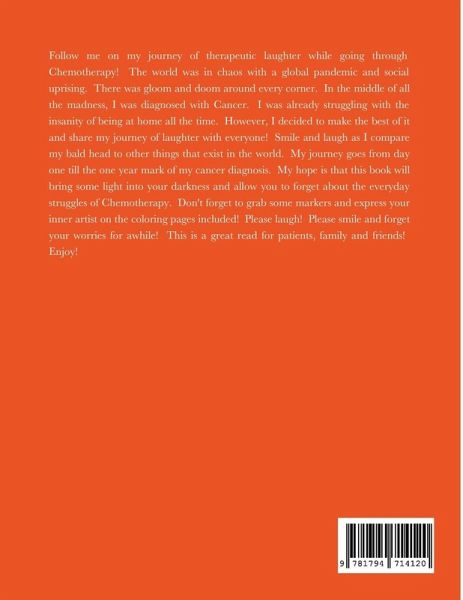 Follow me on my journey of therapeutic laughter while going through Chemotherapy! The world was in chaos with a global pandemic and social uprising. There was gloom and doom around every corner. In the middle of all the madness, I was diagnosed with Cancer. I was already struggling with the insanity of being at home all the time. However, I decided to make the best of it and share my journey of laughter with everyone! Smile and laugh as I compare my bald head to other things that exist in the world. My journey goes from day one till the one year mark of my cancer diagnosis. My hope is that this book will bring some light into your darkness and allow you to forget about the everyday struggles of Chemotherapy. Don't forget to grab some markers and express your inner artist on the coloring pages included! Please laugh! Please smile and forget your worries for awhile! This is a great read for patients, family and friends! Enjoy!