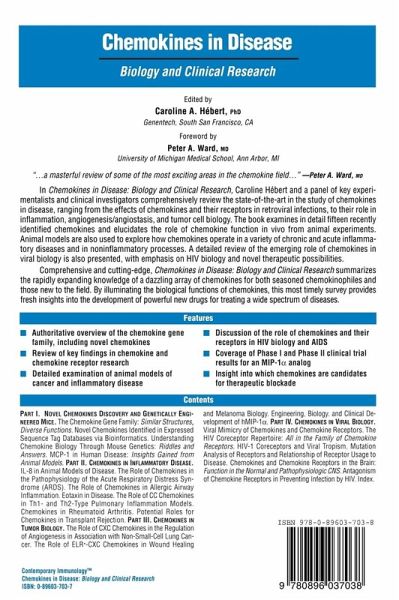 ". . . contains a masterful review of some of the most exciting areas in the chemokine field, ranging from the effects of chemokines and their receptors in retroviral infections, to angiogenesis/antiangiogenesis, to inflammation, to asthma, to transplantation, to name a few of the areas of study. :-Foreword by Peter Ward, PhD . "The editor is a recognized authority in chemokines. Knowledgeable individuals wrote the chapters. . .There is, in this one volume, a major focus on different diseases in which chemokines seem to play particularly important roles and thus the information is easily accessed. "-Doody's Health Scienc Book Review Journal "...the reader will find great interest in reading the very good reviews on the contribution of chemokines in inflammatory diseases....A very nicely documented chapter deals with the presence of chemokine receptors in the central nervous system (CNS) and illustrates the importance to further study this field during CNS related diseases such as Alzheimer's disease or multiple sclerosis....very interesting and important topics are presented in this book.... All scientists and physicians dealing with inflammatory processes should be aware of its content."- Biochimie