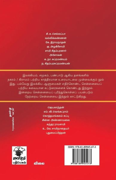 Apart from being the capital city of Tamilnadu, Chennai also holds a unique position in the Tamil cultural space. This book is a collection of articles written by various writers and journalists about the city, edited by writer Pazha. Adhiyamaan. From the perspectives of literature, culture and society this book also puts forth valuable arguments on the city-village binary. From the fringes that form Chennai, to a unique portrait of wartime Chennai, this book is a lens of yesteryear's Chennai that will help understand the city that it is today.