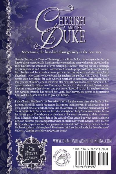Sometimes, the best-laid plans go awry in the best way. Gawain Burton, the Duke of Bromleigh, is a Silver Duke, and everyone in the ton knows these exceptionally handsome forty-something men with some gray salted in their hair have no intention of ever marrying. However, carrying on the Bromleigh title is important, and Gawain is determined to find a proper wife for his nephew and heir. To that end, he attends a house party at the country estate of his cousin, Lady Shoreham, who claims to have found his nephew the perfect wife. Gawain heartily agrees with her choice, for Lady Cherish Northam is intelligent, soft-spoken, has a lovely sense of humor, and is beautiful. Her hair is the color of molten honey and her eyes are a dark brandy brown. The only problem is that she is shy, and Gawain must help her overcome that shyness and put herself forward so that his nephew notices her. Gawain certainly has noticed her...and, dear heaven, she seems to be noticing him. Will his heart allow him to give up Cherish? Lady Cherish Northam's life has taken a turn for the worse after the death of her parents. She finds herself reduced to little more than a servant in what was once her own household. Her uncle, the new Earl of Northam, is a toad who means to keep her on as unpaid help. So when her friend and neighbor, Lady Shoreham, invites her to her house party, Cherish leaps at the chance. She needs to marry to claim the trust fund inheritance her father left in the control of her uncle, but what seems a simple decision becomes quite complicated when she falls in love with Gawain. He is a Silver Duke and everyone knows these gorgeous-as-sin dukes do not marry. Can she harden her heart and marry his nephew? She doesn't think so. But what choice does she have? Unless... Can she possibly win Gawain's heart? Cherish and the Duke is a lighthearted Regency historical romance, the first in the Silver Duke series. Enjoy the read as these heroes who seem to have it all find the one thing that has eluded them throughout their lives...love. The Silver Dukes Book 1 - Cherish and the Duke Book 2 - Moonlight and the Duke Book 3 - Two Nights with the Duke