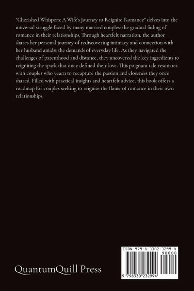 "Cherished Whispers: A Wife's Journey to Reignite Romance" delves into the universal struggle faced by many married couples: the gradual fading of romance in their relationships. Through heartfelt narration, the author shares her personal journey of rediscovering intimacy and connection with her husband amidst the demands of everyday life. As they navigated the challenges of parenthood and distance, they uncovered the key ingredients to reigniting the spark that once defined their love. This poignant tale resonates with couples who yearn to recapture the passion and closeness they once shared. Filled with practical insights and heartfelt advice, this book offers a roadmap for couples seeking to reignite the flame of romance in their own relationships.