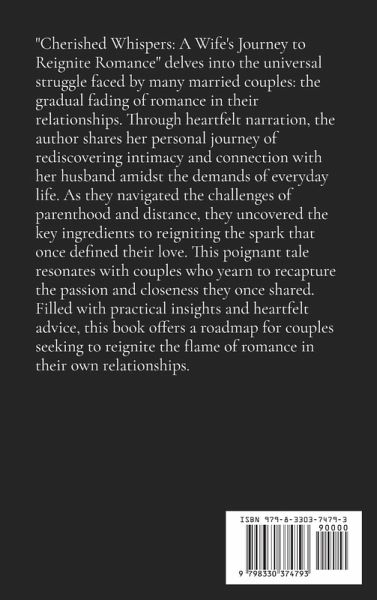 "Cherished Whispers: A Wife's Journey to Reignite Romance" delves into the universal struggle faced by many married couples: the gradual fading of romance in their relationships. Through heartfelt narration, the author shares her personal journey of rediscovering intimacy and connection with her husband amidst the demands of everyday life. As they navigated the challenges of parenthood and distance, they uncovered the key ingredients to reigniting the spark that once defined their love. This poignant tale resonates with couples who yearn to recapture the passion and closeness they once shared. Filled with practical insights and heartfelt advice, this book offers a roadmap for couples seeking to reignite the flame of romance in their own relationships.
