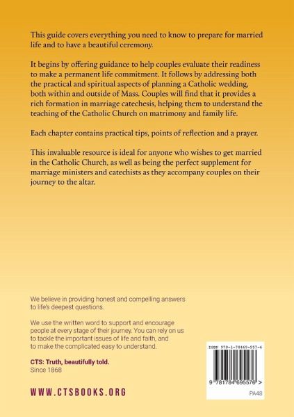 This guide covers everything you need to know to prepare for married life and to have a beautiful ceremony. It begins by offering guidance to help couples evaluate their readiness to make a permanent life commitment. It follows by addressing both the practical and spiritual aspects of planning a Catholic wedding, both within and outside of Mass. Couples will find that it provides a rich formation in marriage catechesis, helping them to understand the teaching of the Catholic Church on matrimony and family life. Each chapter contains practical tips, points of reflection and a prayer. This invaluable resource is ideal for anyone who wishes to get married in the Catholic Church, as well as being the perfect supplement for marriage ministers and catechists as they accompany couples on their journey to the altar.