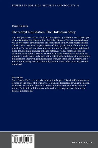 The book presents a record of oral accounts given by liquidators who participated in minimizing the effects of the Chernobyl disaster. The main research goal was to present the circumstances of actions taken in the Chernobyl Exclusion Zone in 1986-1988 from the perspective of direct participants of the events in question. The overall work is complemented with archival, press materials and other documentation never published before, as well as materials from the private archives of the survivors. The book presents the reality of the clean-up operations undertaken in the area of the catastrophe and shows the community of liquidators, their living conditions and everyday life in the Chernobyl Zone, as well as the reality in which Chernobyl veterans lived after returning to their homeland.