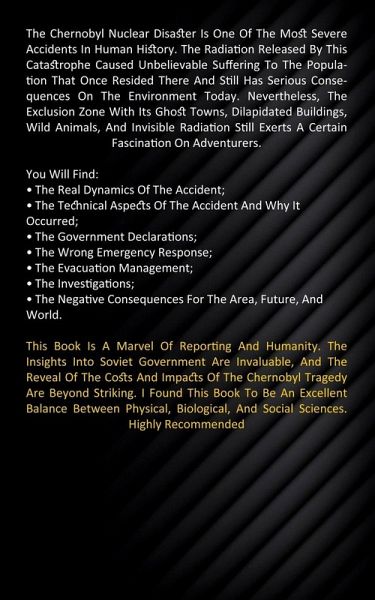 The Chernobyl Nuclear Disaster Is One Of The Most Severe Accidents In Human History. The Radiation Released By This Catastrophe Caused Unbelievable Suffering To The Population That Once Resided There And Still Has Serious Consequences On The Environment Today. Nevertheless, The Exclusion Zone With Its Ghost Towns, Dilapidated Buildings, Wild Animals, And Invisible Radiation Still Exerts A Certain Fascination On Adventurers. You Will Find:The Real Dynamics Of The Accident; The Technical Aspects Of The Accident And Why It Occurred; The Government Declarations; The Wrong Emergency Response; The Evacuation Management; The Investigations; The Negative Consequences For The Area, Future, And World. This Book Is A Marvel Of Reporting And Humanity. The Insights Into Soviet Government Are Invaluable, And The Reveal Of The Costs And Impacts Of The Chernobyl Tragedy Are Beyond Striking. I Found This Book To Be An Excellent Balance Between Physical, Biological, And Social Sciences. Highly Recommended