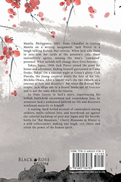 Manila, Philippines, 2003. Dane Chandler is visiting Manila on a writing assignment. Jack Pierce is a tough-talking Korean War veteran. When Jack asks Dane to join him for cards at the pension's cafe, Dane instinctively agrees, sensing the man's "command" presence. What unfolds will change their lives forever. Tokyo, Japan, 1949. Jack Pierce joined the army for honor and adventure, finding himself garrisoned at Camp Drake, Tokyo. On a raucous night at Ginza's glitzy Club Florida, the young corporal meets the love of his life, Michiko Okura. After a touchy start, the two embark on a journey of love and discovery. But when the Korean War erupts, Jack ships out to a brutal landscape of violence and is not the same when he returns. As Dane listens to Jack's story, experiencing his hellish battlefield encounters and tremendous loss, he witnesses Jack's undaunted outlook on life and discovers newfound maturity in himself. A searing, hard-boiled account of camaraderie among soldiers, multi-cultural love, and heartbreak set against the colorful backdrop of post-war Japan and the horrific battle for "Rat Mountain," Cherry Blossoms in Winter is a wild rollercoaster, making one laugh, cry, cheer, and relish the power of the human spirit.