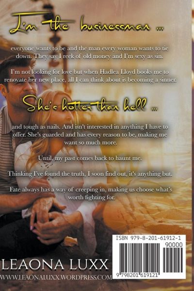 I'm the businessman everyone wants to be and the man every woman wants to tie down. They say I reek of old money and I'm sexy as sin. I'm not looking for love but when Hadlea Lloyd books me to renovate her new place, all I can think about is becoming a sinner. She's hotter than hell and tough as nails. And isn't interested in anything I have to offer. She's guarded and has every reason to be, making me want so much more. Until, my past comes back to haunt me. Thinking I've found the truth, I soon find out, it's anything but. Fate always has a way of creeping in, making us choose what's worth fighting for.
