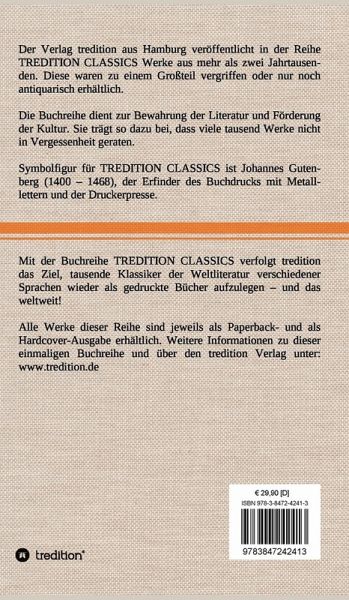 Diese Hardcover-Ausgabe ist Teil der TREDITION CLASSICS. Der Verlag tredition aus Hamburg veröffentlicht in der Buchreihe TREDITION CLASSICS Werke aus mehr als zwei Jahrtausenden. Diese waren zu einem Großteil vergriffen oder nur noch antiquarisch erhältlich. Mit TREDITION CLASSICS verfolgt tredition das Ziel, tausende Klassiker der Weltliteratur verschiedener Sprachen wieder als gedruckte Bücher zu verlegen und das weltweit! Die Buchreihe dient zur Bewahrung der Literatur und Förderung der Kultur. Sie trägt so dazu bei, dass viele tausend Werke nicht in Vergessenheit geraten.