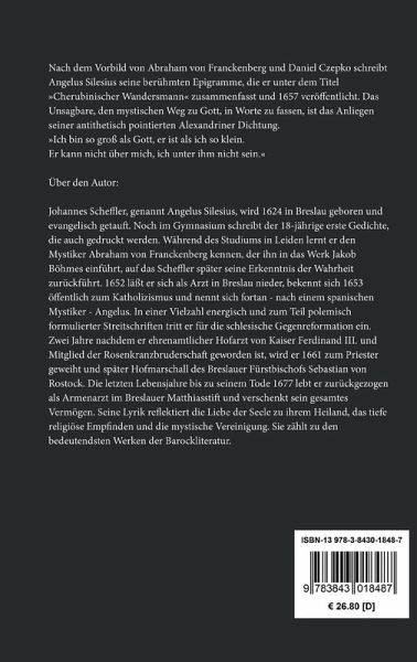 Johannes Scheffler, genannt Angelus Silesius, wird 1624 in Breslau geboren und evangelisch getauft. Noch im Gymnasium schreibt der 18-jährige erste Gedichte, die auch gedruckt werden. Während des Studiums in Leiden lernt er den Mystiker Abraham von Franckenberg kennen, der ihn in das Werk Jakob Böhmes einführt, auf das Scheffler später seine Erkenntnis der Wahrheit zurückführt. 1652 läßt er sich als Arzt in Breslau nieder, bekennt sich 1653 öffentlich zum Katholizismus und nennt sich fortan - nach einem spanischen Mystiker - Angelus. In einer Vielzahl energisch und zum Teil polemisch formulierter Streitschriften tritt er für die schlesische Gegenreformation ein. Zwei Jahre nachdem er ehrenamtlicher Hofarzt von Kaiser Ferdinand III. und Mitglied der Rosenkranzbruderschaft geworden ist, wird er 1661 zum Priester geweiht und später Hofmarschall des Breslauer Fürstbischofs Sebastian von Rostock. Die letzten Lebensjahre bis zu seinem Tode 1677 lebt er zurückgezogen als Armenarzt im Breslauer Matthiasstift und verschenkt sein gesamtes Vermögen. Seine Lyrik reflektiert die Liebe der Seele zu ihrem Heiland, das tiefe religiöse Empfinden und die mystische Vereinigung. Sie zählt zu den bedeutendsten Werken der Barockliteratur.