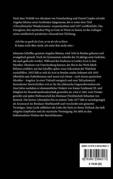 Johannes Scheffler, genannt Angelus Silesius, wird 1624 in Breslau geboren und evangelisch getauft. Noch im Gymnasium schreibt der 18-jährige erste Gedichte, die auch gedruckt werden. Während des Studiums in Leiden lernt er den Mystiker Abraham von Franckenberg kennen, der ihn in das Werk Jakob Böhmes einführt, auf das Scheffler später seine Erkenntnis der Wahrheit zurückführt. 1652 läßt er sich als Arzt in Breslau nieder, bekennt sich 1653 öffentlich zum Katholizismus und nennt sich fortan - nach einem spanischen Mystiker - Angelus. In einer Vielzahl energisch und zum Teil polemisch formulierter Streitschriften tritt er für die schlesische Gegenreformation ein. Zwei Jahre nachdem er ehrenamtlicher Hofarzt von Kaiser Ferdinand III. und Mitglied der Rosenkranzbruderschaft geworden ist, wird er 1661 zum Priester geweiht und später Hofmarschall des Breslauer Fürstbischofs Sebastian von Rostock. Die letzten Lebensjahre bis zu seinem Tode 1677 lebt er zurückgezogen als Armenarzt im Breslauer Matthiasstift und verschenkt sein gesamtes Vermögen. Seine Lyrik reflektiert die Liebe der Seele zu ihrem Heiland, das tiefe religiöse Empfinden und die mystische Vereinigung. Sie zählt zu den bedeutendsten Werken der Barockliteratur.