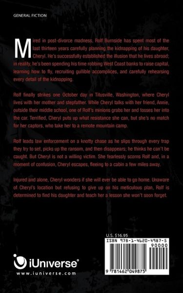 Mired in post-divorce madness, Rolf Burnside has spent most of the last thirteen years carefully planning the kidnapping of his daughter, Cheryl. He's successfully established the illusion that he lives abroad; in reality, he's been spending his time robbing West Coast banks to raise capital, learning how to fly, recruiting gullible accomplices, and carefully rehearsing every detail of the kidnapping. Rolf finally strikes one October day in Titusville, Washington, where Cheryl lives with her mother and stepfather. While Cheryl talks with her friend, Annie, outside their middle school, one of Rolf's minions grabs her and tosses her into the car. Terrified, Cheryl puts up what resistance she can, but she's no match for her captors, who take her to a remote mountain camp. Rolf leads law enforcement on a knotty chase as he slips through every trap they try to set, picks up the ransom, and then disappears; he thinks he can't be caught. But Cheryl is not a willing victim. She fearlessly scorns Rolf and, in a moment of confusion, Cheryl escapes, fleeing to a cabin a few miles away. Injured and alone, Cheryl wonders if she will ever be able to go home. Unaware of Cheryl's location but refusing to give up on his meticulous plan, Rolf is determined to find his daughter and teach her a lesson she won't soon forget.