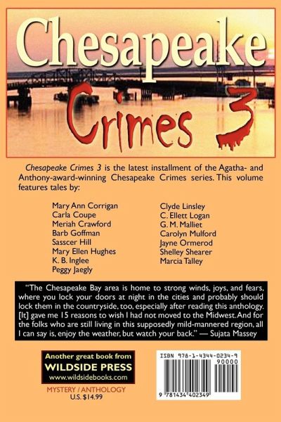 Chesapeake Crimes 3 is the latest installment of the Agatha- and Anthony-award-winning Chesapeake Crimes series. "The Chesapeake Bay area is home to strong winds, joys, and fears, where you lock your doors at night in the cities and probably should lock them in the countryside, too, especially after reading this anthology. [It] gave me 15 reasons to wish I had not moved to the Midwest. And for the folks who are still living in this supposedly mild-mannered region, all I can say is, enjoy the weather, but watch your back." -- Sujata Massey