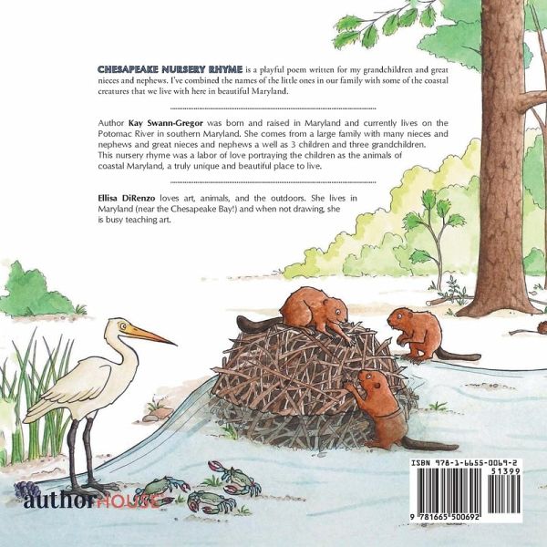 Author Kay Swann-Gregor was born and raised in Maryland and currently lives on the Potomac River in southern Maryland. She comes from a large family with many nieces and nephews and great nieces and nephews a well as 3 children and three grandchildren. This nursery rhyme was a labor of love portraying the children as the animals of coastal Maryland, a truly unique and beautiful place to live.