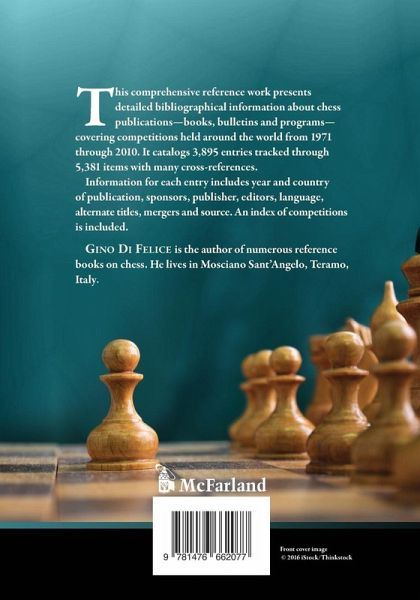 This comprehensive reference work presents detailed bibliographical information about chess publications--books, bulletins and programs--covering competitions held around the world from 1971 through 2010. It catalogs 3,895 entries tracked through 5,381 items with many cross-references. Information for each entry includes year and country of publication, sponsors, publisher, editors, language, alternate titles, mergers and source. An index of competitions is included.