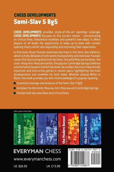 Bryan Paulsen examines the most theoretically important and instructive games in the 5 Bg5 Semi-Slav. This includes the fascinating Botvinnik Variation, the solid Moscow Variation, the razor-sharp Anti-Moscow Gambit and the popular Cambridge Springs Defence.