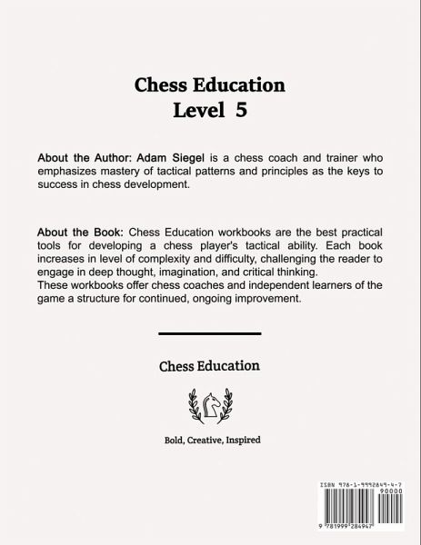 Chess Education recognizes the difficulty players have in improving. Receive the best material for studying based on your level and improve your calculation and tactical skills step-by-step. The puzzles are specifically chosen based on their tactical theme and level of complexity to ensure you maximize your chess training. Chess Education Level 5 is a workbook for chess players between 1300-1500 Elo. Solving the puzzles in this workbook requires precision, forethought, and pattern recognition. After completing the workbook you will be one step closer to becoming a chess master.