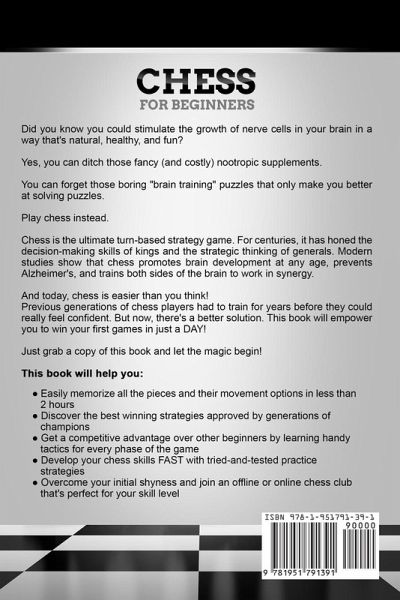 If You Could Do Just ONE Thing For Your Brain, Learn This Game! Did you know you could stimulate the growth of nerve cells in your brain in a way that's natural, healthy, and fun? Yes, you can ditch those fancy (and costly) nootropic supplements. You can forget those boring "brain training" puzzles that only make you better at solving puzzles. Play chess instead. Chess is the ultimate turn-based strategy game. For centuries, it has honed the decision-making skills of kings and the strategic thinking of generals. Modern studies show that chess promotes brain development at any age, prevents Alzheimer's, and trains both sides of the brain to work in synergy. And today, chess is easier than you think! Previous generations of chess players had to train for years before they could really feel confident. But now, there's a better solution. This book will empower you to win your first games in just a DAY! Just grab a copy of this book and let the magic begin!This book will help you:Easily memorize all the pieces and their movement options in less than 2 hours Discover the best winning strategies approved by generations of champions Get a competitive advantage over other beginners by learning handy tactics for every phase of the game Develop your chess skills FAST with tried-and-tested practice strategies Overcome your initial shyness and join an offline or online chess club that's perfect for your skill level No matter if you're just learning the rules of chess or looking for ways to boost your skills FAST, this book will take your playing to a whole new level. You don't have to spend years memorizing possible turn combinations - simply learn the underlying tactics and strategies and start enjoying confident victories from Day 1!