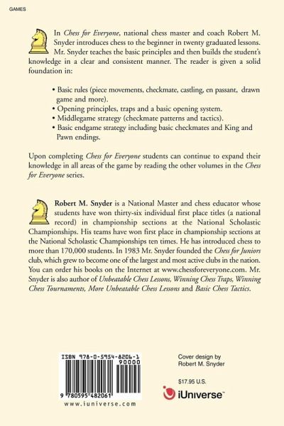 In Chess for Everyone, national chess master and coach Robert M. Snyder introduces chess to the beginner in twenty graduated lessons. Mr. Snyder teaches the basic principles and then builds the student's knowledge in a clear and consistent manner. The reader is given a solid foundation in: Basic rules(piece movements, checkmate, castling, en passant, drawn game and more). Opening principles, traps and a basic opening system. Middlegame strategy (checkmate patterns and tactics). Basic endgame strategy including basic checkmates and King and Pawn endings. Upon completing Chess for Everyone students can continue to expand their knowledge in all areas of the game by reading the other volumes in the Chess for Everyone series.