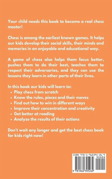 Your child needs this book to become a real chess master! Chess is among the earliest known games. It helps our kids develop their social skills, their minds and memories in an enjoyable and educational way. A game of chess also helps them focus better, pushes them to do their best, teaches them to respect their adversaries, and they can use the lessons they learn in other parts of their lives. In this book our kids will learn to:Play chess from scratch Know the pieces, rules and their moves Find out how to win in different ways Improve their concentration and creativity Get better at reading Analyze the results of their actions Don't wait any longer and get the best chess book for kids right now!