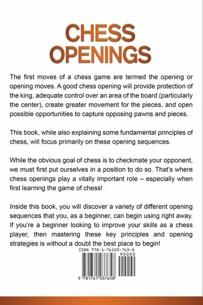 CHESS OPENINGS The first moves of a chess game are termed the opening or opening moves. A good chess opening will provide protection of the king, adequate control over an area of the board (particularly the center), create greater movement for the pieces, and open possible opportunities to capture opposing pawns and pieces. This book, while also explaining some fundamental principles of chess, will focus primarily on these opening sequences. While the obvious goal of chess is to checkmate your opponent, we must first put ourselves in a position to do so. That's where chess openings play a vitally important role - especially when first learning the game of chess! Inside this book, you will discover a variety of different opening sequences that you, as a beginner, can begin using right away. If you're a beginner looking to improve your skills as a chess player, then mastering these key principles and opening strategies is without a doubt the best place to begin!