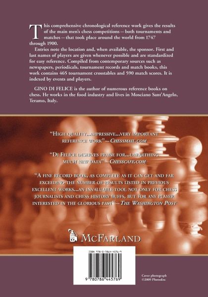 This comprehensive chronological reference work gives the results of the main men's chess competitions--both tournaments and matches--that took place around the world from 1747 through 1900. Entries note the location and, when available, the sponsor. First and last names of players are given whenever possible and are standardized for easy reference. Compiled from contemporary sources such as newspapers, periodicals, tournament records and match books, this work contains 465 tournament crosstables and 590 match scores. It is indexed by events and players.