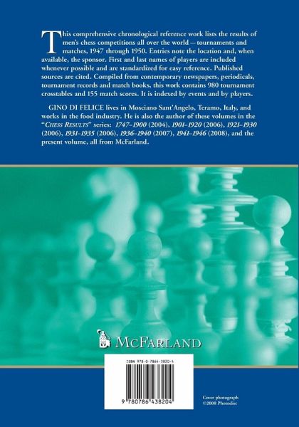 This comprehensive chronological reference work lists the results of men's chess competitions all over the world--tournaments and matches, 1947 through 1950. Entries note the location and, when available, the sponsor. First and last names of players are included whenever possible and are standardized for easy reference. Published sources are cited. Compiled from contemporary newspapers, periodicals, tournament records and match books, this work contains 980 tournament crosstables and 155 match scores. It is indexed by events and by players.