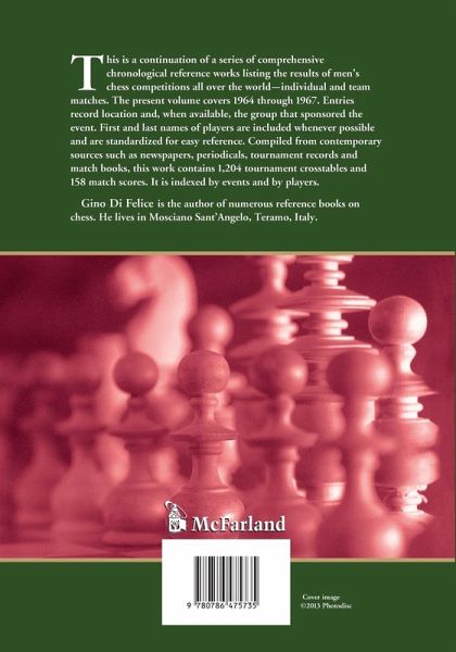 This is a continuation of a series of comprehensive chronological reference works listing the results of men's chess competitions all over the world--individual and team matches. The present volume covers 1964 through 1967. Entries record location and, when available, the group that sponsored the event. First and last names of players are included whenever possible and are standardized for easy reference. Compiled from contemporary sources such as newspapers, periodicals, tournament records and match books, this work contains 1,204 tournament crosstables and 158 match scores. It is indexed by events and by players.