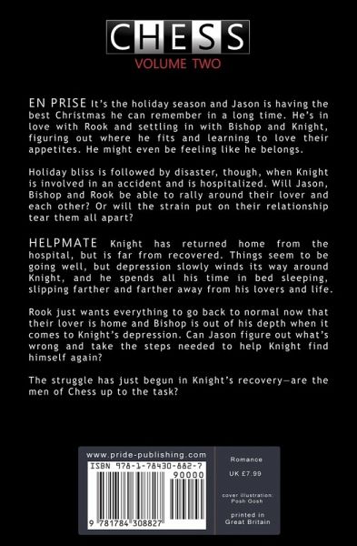 En Prise Just when things seem to be at their best, disaster strikes. Will all the men of Chess survive? It's the holiday season and Jason is having the best Christmas he can remember in a long time. He's in love with Rook and settling in with Bishop and Knight, figuring out where he fits and learning to love their appetites. He might even be feeling like he belongs. Holiday bliss is followed by disaster, though, when Knight is involved in an accident and is hospitalized. Will Jason, Bishop and Rook be able to rally around their lover and each other? Or will the strain put on their relationship tear them all apart? Follow the moves made by the men of Chess and find out... Helpmate Knight is home from the hospital, so everything should be back to normal, right? Things are never that easy, though, and the men of Chess must fight to get their lives back. Knight has returned home from the hospital, but is far from recovered. Things seem to be going well, but depression slowly winds its way around Knight, and he spends all his time in bed sleeping, slipping farther and farther away from his lovers and life. Rook just wants everything to go back to normal now that their lover is home and Bishop is out of his depth when it comes to Knight's depression. Can Jason figure out what's wrong and take the steps needed to help Knight find himself again? The struggle has just begun in Knight's recovery-are the men of Chess up to the task? Find out in this fourth instalment of the Chess series.