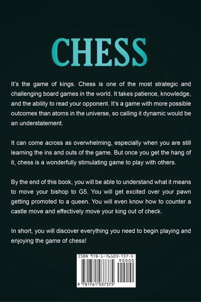 CHESS It's the game of kings. Chess is one of the most strategic and challenging board games in the world. It takes patience, knowledge, and the ability to read your opponent. It's a game with more possible outcomes than atoms in the universe, so calling it dynamic would be an understatement. It can come across as overwhelming, especially when you are still learning the ins and outs of the game. But once you get the hang of it, chess is a wonderfully stimulating game to play with others. By the end of this book, you will be able to understand what it means to move your bishop to G5. You will get excited over your pawn getting promoted to a queen. You will even know how to counter a castle move and effectively move your king out of check. In short, you will discover everything you need to begin playing and enjoying the game of chess!