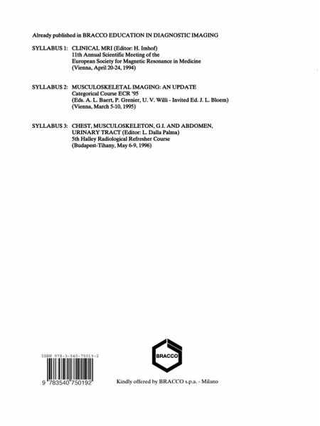 This volume brings together the papers which 33 radiologists, chosen among the leading European experts, presented at the Halley Project 1996 Refresher Course. The project, which I promoted and co-ordinated, started out under the aegis of the European Association of Radiology in 1992 with the aim of fostering the advancement of Radiology in various countries of Eastern Europe: Bulgaria, the Czech Republic, Slovakia, Hungary, Poland and Rumania. Thanks to the expertise and enthusiasm of distinguished colleagues from various countries in Western Europe and to the generosity of two sponsors, Bracco International and Schering A.G., it was possible to set up, in 1992, 1993, 1994 and 1995. four Faculties of Experts in Uroradiology. Gastrointestinal and Abdominal Radiology, Chest Radiology and Skeletal Radiology. These four faculties then gave a refresher course on the four radiological subspecialities in the six nations mentioned above. The project was called Halley, after the famous comet, in a desire to express the idea of spreading Western radiological culture among Eastern radiologists who were visited in their own countries. In these 4 years. as project leader, I accompanied the four Faculties during their tour and was thus able to experience the various local situations, not only in radiological terms but also socially. thanks to the ever warm relationships among radiologists of different nationalities and of different ages who attended the courses.