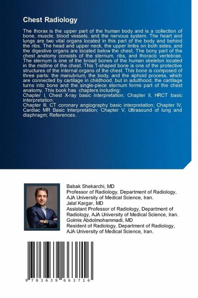 The thorax is the upper part of the human body and is a collection of bone, muscle, blood vessels, and the nervous system. The heart and lungs are two vital organs located in this part of the body and behind the ribs. The head and upper neck, the upper limbs on both sides, and the digestive organs are located below the chest. The bony part of the chest anatomy consists of the sternum, ribs, and thoracic vertebrae. The sternum is one of the broad bones of the human skeleton located in the midline of the chest. This T-shaped bone is one of the protective structures of the internal organs of the chest. This bone is composed of three parts: the manubrium, the body, and the xiphoid process, which are connected by cartilage in childhood, but in adulthood, the cartilage turns into bone and the single-piece sternum forms part of the chest anatomy. This book has chapters including: Chapter I, Chest X-ray basic interpretation; Chapter II, HRCT basic interpretation; Chapter III, CT coronaryangiography basic interpretation; Chapter IV, Cardiac MR Basic Interpretation; Chapter V, Ultrasound of lung and diaphragm; References.