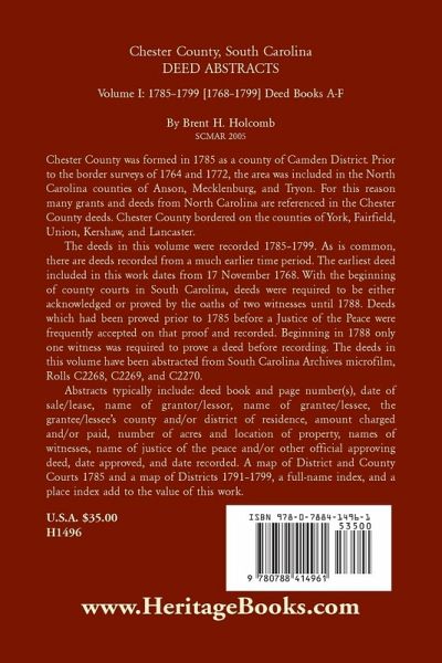 Chester County was formed in 1785 as a county of Camden District. Prior to the border surveys of 1764 and 1772, the area was included in the North Carolina counties of Anson, Mecklenburg, and Tryon. For this reason many grants and deeds from North Carolina are referenced in the Chester County deeds. Chester County bordered on the counties of York, Fairfield, Union, Kershaw, and Lancaster. The deeds in this volume were recorded 1785-1799. As is common, there are deeds recorded from a much earlier time period. The earliest deed included in this work dates from 17 November 1768. With the beginning of county courts in South Carolina, deeds were required to be either acknowledged or proved by the oaths of two witnesses until 1788. Deeds which had been proved prior to 1785 before a Justice of the Peace were frequently accepted on that proof and recorded. Beginning in 1788 only one witness was required to prove a deed before recording. The deeds in this volume have been abstracted from South Carolina Archives microfilm, Rolls C2268, C2269, and C2270. Abstracts typically include: deed book and page number(s), date of sale/lease, name of grantor/lessor, name of grantee/lessee, the grantee/lessee's county and/or district of residence, amount charged and/or paid, number of acres and location of property, names of witnesses, name of justice of the peace and/or other official approving deed, date approved, and date recorded. A map of District and County Courts 1785 and a map of Districts 1791-1799, a full-name index, and a place index add to the value of this work. (2005), 2021, 6x9, paper, index, 298 pp.