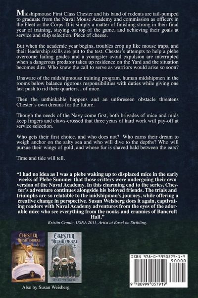 Midshipmouse First Class Chester and his band of rodents are tail-pumped to graduate from the Naval Mouse Academy and commission as officers in the Fleet of the Corps. It is simply a matter of finishing strong in their final year of training, staying on top of the game, and achieving their goals at service and ship selection. Piece of cheese. But when the academic year begins, troubles crop up like mouse traps, and their leadership skills are put to the test. Chester's attempts to help a plebe overcome failing grades and a youngster avoid expulsion are interrupted when a dangerous predator takes up residence on the Yard and the situation becomes dire. Who knew the call to serve would arise so soon? Unaware of the midshipmouse training program, human midshipmen in the rooms below balance rigorous responsibilities with duties while giving one last push to rid their quarters...of mice. Then the unthinkable happens and an unforeseen obstacle threatens Chester's own dreams for the future. Though the needs of the Navy come first, both brigades of mice and mids keep fingers and claws-crossed that three years of hard work will pay-off at service selection. Who gets their first choice and who does not? Who earns their dream to weigh anchor on the salty sea and who will dive to the depths? Who will pursue their wings of gold and whose fur is shaved bald between the ears? Time and tide will tell.