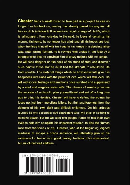 Chester finds himself forced to take part in a project he can no longer turn his back on, destiny has already paved his way and all he can do is to follow it, if he wants to regain charge of his life, which is falling apart. From one day to the next, he loses all certainty, his money, his home, he no longer has a job and all his hopes are lost, when he finds himself with his head in his hands in a desolate alley way. After having fainted, he is revived with a slap in the face by a stranger who tries to convince him of crazy notions with no sense. On his arduous journey he will encounter evil characters who will stop at nothing to achieve power, but he will also find people ready to risk their own lives to help him complete his important mission: to free the Human race from the forces of evil. Chester, who at the beginning feigned madness to escape a prison sentence, will ultimately give up his existence for the common good, saving the lives of his unexpected, but much beloved children.