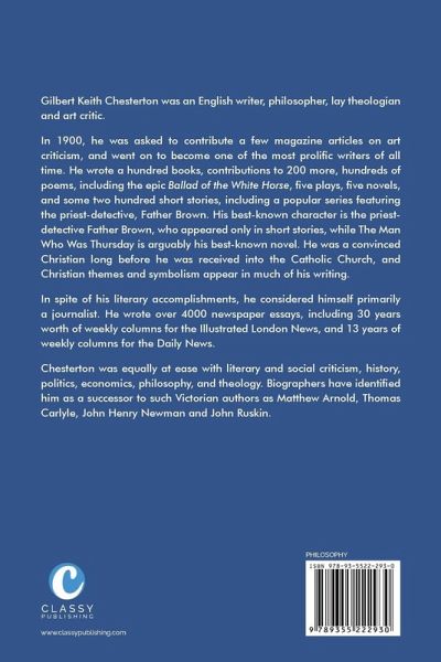 Three Books in One! The three great apologies of G.K. Chesterton in one volume: Orthodoxy, Heretics & The Everlasting Man. This collection combines three of G.K. Chesterton's most recognized works into one convenient volume. This is perfect volume for Chesterton lovers, and students. Included in this book: - Orthodoxy - Heretics - The Everlasting Man In Orthodoxy, G.K. Chesterton gives a stirring defense of Christianity. Chesterton fought against the reductionist materialism with laughter, joy, and gratitude for the beauty of the world God has given us. We usually think of orthodoxy and the tenets of the Christian faith as dry, arbitrary, and perhaps even nonsensical. Chesterton shows that orthodoxy is beautiful and fits perfectly the strange, quirky world. For those of us who do not pay any attention to the strangeness of the world, this book is essential reading. The world may not have fairies, but it does have the sun, rivers, trees, and the sky, and they are as strange as anything we will find in a fairy tale. Read this book, then go outside and marvel. In Heretics, the topics Chesterton debates are as universal to the "vague moderns" of the 21st century as they were to those of the 20th. Focusing on "heretics" - those who pride themselves on their superiority to Christian views - Chesterton appraises prominent figures who fall into that category from the literary and art worlds. Luminaries such as Rudyard Kipling, George Bernard Shaw, H. G. Wells, and James McNeill Whistler come under the author's scrutiny, where they meet with equal measures of his characteristic wisdom and good humor. The topics he touches upon range from cosmology to anthropology to soteriology and he argues against French nihilism, German humanism, English utilitarianism, the syncretism of 'the vague modern', Social Darwinism, eugenics and the arrogance and misanthropy of the European intelligentsia. Together with Orthodoxy, this book is regarded as central to his corpus of moral theology. What, if anything, is it that makes the human uniquely human? This, in part, is the question that G.K. Chesterton starts with exploration of human history in this classic. Responding to the evolutionary materialism of his contemporary H.G. Wells, Chesterton in this work affirms human uniqueness and the unique message of the Christian faith. Writing at a time when social Darwinism was increasingly popular, Chesterton argued that the idea that society has been steadily progressing from a starting point of primitivism towards civilization, and of Jesus Christ as simply another charismatic figure, is completely inaccurate. Chesterton saw in Christianity a rare blending of philosophy and mythology, which he felt satisfies both the mind and the heart. Here, as so often in Chesterton, we sense a lived, awakened faith. All that he writes derives from a keen intellect guided by the heart's own knowledge. Gilbert Keith Chesterton was an English writer, philosopher, Christian apologist, a literary and art critic. He has been referred to as the ""prince of paradox"". Of his writing style, Time observed: ""Whenever possible, Chesterton made his points with popular sayings, proverbs, allegories-first carefully turning them inside out."" Chesterton created the fictional priest-detective Father Brown, and wrote on apologetics. Even some of those who disagree with him have recognised the wide appeal of such works as Orthodoxy and The Everlasting Man. Chesterton routinely referred to himself as an orthodox Christian, and came to identify this position more and more with Catholicism, eventually converting to Roman Catholicism from high church Anglicanism. Biographers have identified him as a successor to such Victorian authors as Matthew Arnold, Thomas Carlyle, John Henry Newman and John Ruskin.