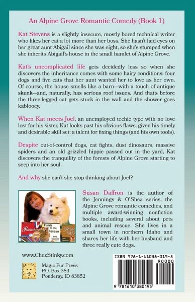 Kat Stevens is a slightly insecure, mostly bored technical writer who likes her cat a lot more than her boss. She hasn't laid eyes on her great aunt Abigail since she was eight, so she's stumped when she inherits Abigail's house in the small hamlet of Alpine Grove. Kat's uncomplicated life gets decidedly less so when she discovers the inheritance comes with some hairy conditions: four dogs and five cats that her aunt wanted her to love as her own. Of course, the house smells like a barn--with a touch of antique skunk--and, naturally, has serious roof issues. And that's before the three-legged cat gets stuck in the wall and the shower goes kablooey. When Kat meets Joel, an unemployed techie type with no love lost for his sister, Kat looks past his obvious flaws, given his timely and desirable skill set: a talent for fixing things (and his own tools). Despite out-of-control dogs, cat fights, dust dinosaurs, massive spiders and an old grizzled hippie passed out in the yard, Kat discovers the tranquility of the forests of Alpine Grove starting to seep into her soul. And why she can't she stop thinking about Joel?