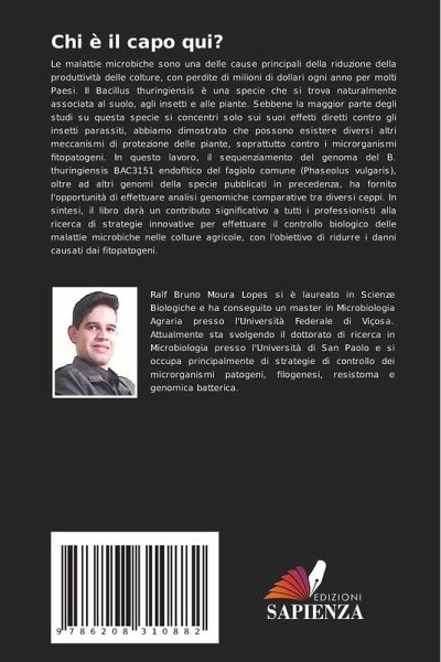 Le malattie microbiche sono una delle cause principali della riduzione della produttività delle colture, con perdite di milioni di dollari ogni anno per molti Paesi. Il Bacillus thuringiensis è una specie che si trova naturalmente associata al suolo, agli insetti e alle piante. Sebbene la maggior parte degli studi su questa specie si concentri solo sui suoi effetti diretti contro gli insetti parassiti, abbiamo dimostrato che possono esistere diversi altri meccanismi di protezione delle piante, soprattutto contro i microrganismi fitopatogeni. In questo lavoro, il sequenziamento del genoma del B. thuringiensis BAC3151 endofitico del fagiolo comune (Phaseolus vulgaris), oltre ad altri genomi della specie pubblicati in precedenza, ha fornito l'opportunità di effettuare analisi genomiche comparative tra diversi ceppi. In sintesi, il libro darà un contributo significativo a tutti i professionisti alla ricerca di strategie innovative per effettuare il controllo biologico delle malattie microbiche nelle colture agricole, con l'obiettivo di ridurre i danni causati dai fitopatogeni.