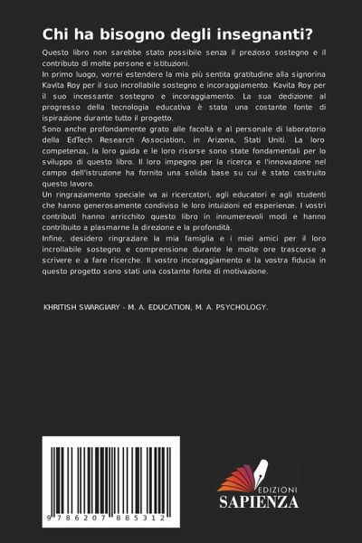 Questo libro non sarebbe stato possibile senza il prezioso sostegno e il contributo di molte persone e istituzioni.In primo luogo, vorrei estendere la mia più sentita gratitudine alla signorina Kavita Roy per il suo incrollabile sostegno e incoraggiamento. Kavita Roy per il suo incessante sostegno e incoraggiamento. La sua dedizione al progresso della tecnologia educativa è stata una costante fonte di ispirazione durante tutto il progetto.Sono anche profondamente grato alle facoltà e al personale di laboratorio della EdTech Research Association, in Arizona, Stati Uniti. La loro competenza, la loro guida e le loro risorse sono state fondamentali per lo sviluppo di questo libro. Il loro impegno per la ricerca e l'innovazione nel campo dell'istruzione ha fornito una solida base su cui è stato costruito questo lavoro.Un ringraziamento speciale va ai ricercatori, agli educatori e agli studenti che hanno generosamente condiviso le loro intuizioni ed esperienze. I vostri contributi hanno arricchito questo libro in innumerevoli modi e hanno contribuito a plasmarne la direzione e la profondità.Infine, desidero ringraziare la mia famiglia e i miei amici per il loro incrollabile sostegno e comprensione durante le molte ore trascorse a scrivere e a fare ricerche. Il vostro incoraggiamento e la vostra fiducia in questo progetto sono stati una costante fonte di motivazione.