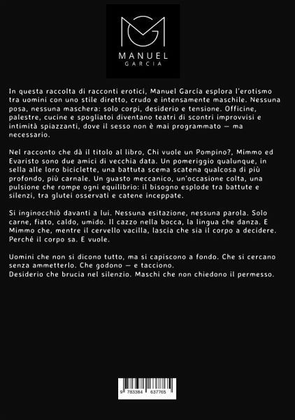 In questa raccolta di racconti erotici, Manuel García esplora l'erotismo tra uomini con uno stile diretto, crudo e intensamente maschile. Nessuna posa, nessuna maschera: solo corpi, desiderio e tensione. Officine, palestre, cucine e spogliatoi diventano teatri di scontri improvvisi e intimità spiazzanti, dove il sesso non è mai programmato - ma necessario.Nel racconto che dà il titolo al libro, Chi vuole un Pompino?, Mimmo ed Evaristo sono due amici di vecchia data. Un pomeriggio qualunque, in sella alle loro biciclette, una battuta scema scatena qualcosa di più profondo, più carnale. Un guasto meccanico, un'occasione colta, una pulsione che rompe ogni equilibrio: il bisogno esplode tra battute e silenzi, tra glutei osservati e catene inceppate.Si inginocchiò davanti a lui. Nessuna esitazione, nessuna parola. Solo carne, fiato, caldo, umido. Il cazzo nella bocca, la lingua che danza. E Mimmo che, mentre il cervello vacilla, lascia che sia il corpo a decidere. Perché il corpo sa. E vuole.Uomini che non si dicono tutto, ma si capiscono a fondo. Che si cercano senza ammetterlo. Che godono - e tacciono.Desiderio che brucia nel silenzio. Maschi che non chiedono il permesso.