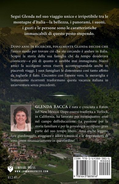 Segui Glenda nel suo viaggio unico e irripetibile tra le montagne d'Italia-la bellezza, i panorami, i suoni, i gusti e le persone sono le caratteristiche immancabili di questo posto stupendo. Dopo anni di ricerche, finalmente Glenda decide che l'unico modo per trovare ciò che sta cercando è andare in Italia. Scopre la storia della sua famiglia che da tempo desiderava conoscere-e più di quanto si sarebbe mai immaginata. Nuovi amici la accolgono senza riserve accompagnandola anche in piacevoli viaggi. I suoi famigliari le dimostrano così tanto affetto da toglierle il fiato. L'incontro con l'amore vero, la meraviglia e l'entusiasmo ricorrenti trasformano questa vacanza italiana in un'avventura senza precedenti.