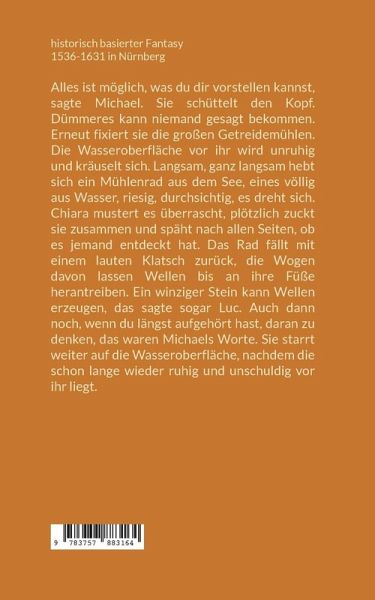 historisch basierter Fantasy, 1536-1631 in NürnbergAlles ist möglich, was du dir vorstellen kannst, sagte Michael. Sie schüttelt den Kopf. Dümmeres kann niemand gesagt bekommen. Erneut fixiert sie die großen Getreidemühlen. Die Wasseroberfläche vor ihr wird unruhig und kräuselt sich. Langsam, ganz langsam hebt sich ein Mühlenrad aus dem See, eines völlig aus Wasser, riesig, durchsichtig, es dreht sich. Chiara mustert es überrascht, plötzlich zuckt sie zusammen und späht nach allen Seiten, ob es jemand entdeckt hat. Das Rad fällt mit einem lauten Klatsch zurück, die Wogen davon lassen Wellen bis an ihre Füße herantreiben. Ein winziger Stein kann Wellen erzeugen, das sagte sogar Luc. Auch dann noch, wenn du längst aufgehört hast, daran zu denken, das waren Michaels Worte. Sie starrt weiter auf die Wasseroberfläche, nachdem die schon lange wieder ruhig und unschuldig vor ihr liegt.