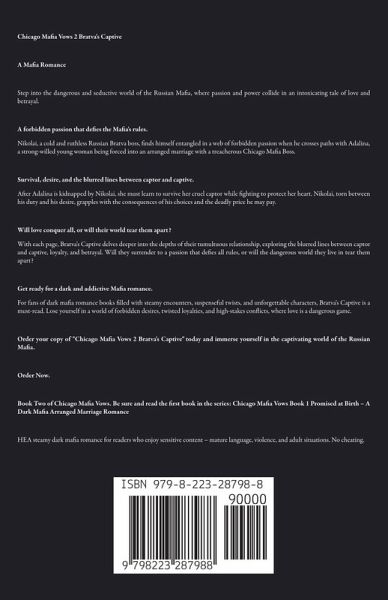 Chicago Mafia Vows 2 Bratva's Captive A Mafia Romance Step into the dangerous and seductive world of the Russian Mafia, where passion and power collide in an intoxicating tale of love and betrayal. A forbidden passion that defies the Mafia's rules. Nikolai, a cold and ruthless Russian Bratva boss, finds himself entangled in a web of forbidden passion when he crosses paths with Adalina, a strong-willed young woman being forced into an arranged marriage with a treacherous Chicago Mafia Boss. Survival, desire, and the blurred lines between captor and captive. After Adalina is kidnapped by Nikolai, she must learn to survive her cruel captor while fighting to protect her heart. Nikolai, torn between his duty and his desire, grapples with the consequences of his choices and the deadly price he may pay. Will love conquer all, or will their world tear them apart? With each page, Bratva's Captive delves deeper into the depths of their tumultuous relationship, exploring the blurred lines between captor and captive, loyalty, and betrayal. Will they surrender to a passion that defies all rules, or will the dangerous world they live in tear them apart? Get ready for a dark and addictive Mafia romance. For fans of dark mafia romance books filled with steamy encounters, suspenseful twists, and unforgettable characters, Bratva's Captive is a must-read. Lose yourself in a world of forbidden desires, twisted loyalties, and high-stakes conflicts, where love is a dangerous game. Order your copy of "Chicago Mafia Vows 2 Bratva's Captive" today and immerse yourself in the captivating world of the Russian Mafia. Order Now. Book Two of Chicago Mafia Vows. Be sure and read the first book in the series: Chicago Mafia Vows Book 1 Promised at Birth – A Dark Mafia Arranged Marriage Romance HEA steamy dark mafia romance for readers who enjoy sensitive content – mature language, violence, and adult situations. No cheating.