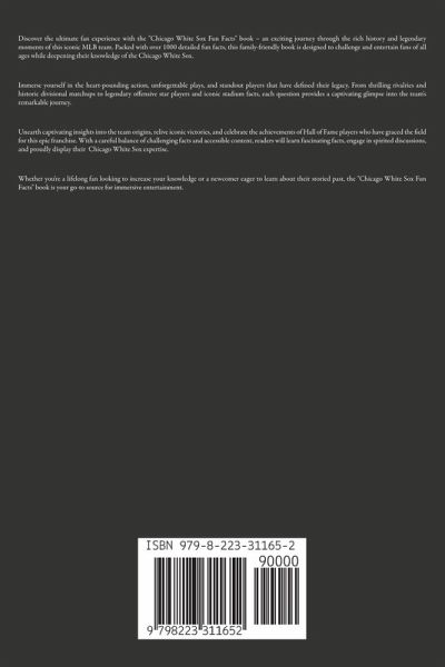 Discover the ultimate fan experience with the "Chicago White Sox Fun Facts" book – an exciting journey through the rich history and legendary moments of this iconic MLB team. Packed with over 1000 detailed fun facts, this family-friendly book is designed to challenge and entertain fans of all ages while deepening their knowledge of the Chicago White Sox. Immerse yourself in the heart-pounding action, unforgettable plays, and standout players that have defined their legacy. From thrilling rivalries and historic divisional matchups to legendary offensive star players and iconic stadium facts, each question provides a captivating glimpse into the team's remarkable journey. Unearth captivating insights into the team origins, relive iconic victories, and celebrate the achievements of Hall of Fame players who have graced the field for this epic franchise. With a careful balance of challenging facts and accessible content, readers will learn fascinating facts, engage in spirited discussions, and proudly display their Chicago White Sox expertise. Whether you're a lifelong fan looking to increase your knowledge or a newcomer eager to learn about their storied past, the "Chicago White Sox Fun Facts" book is your go-to source for immersive entertainment.