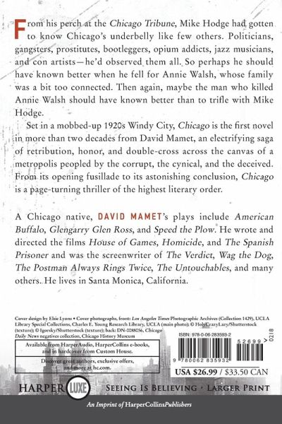 A big-shouldered, big-trouble thriller set in mobbed-up 1920s Chicago--a city where some people knew too much, and where everyone should have known better--by the Oscar-nominated screenwriter of The Untouchables and Pulitzer Prize-winning playwright of Glengarry Glen Ross. Mike Hodge--veteran of the Great War, big shot of the Chicago Tribune, medium fry--probably shouldn't have fallen in love with Annie Walsh. Then, again, maybe the man who killed Annie Walsh have known better than to trifle with Mike Hodge. In Chicago, David Mamet has created a bracing, kaleidoscopic page-turner that roars through the Windy City's underground on its way to a thunderclap of a conclusion. Here is not only his first novel in more than two decades, but the book he has been building to for his whole career. Mixing some of his most brilliant fictional creations with actual figures of the era, suffused with trademark "Mamet Speak," richness of voice, pace, and brio, and exploring--as no other writer can--questions of honor, deceit, revenge, and devotion, Chicago is that rarest of literary creations: a book that combines spectacular elegance of craft with a kinetic wallop as fierce as the February wind gusting off Lake Michigan.