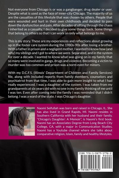 Not everyone from Chicago is or was a gangbanger, drug dealer or user. Despite the face of inner-city Chicago, the majority of us were the casualties of this lifestyle chosen by others. Others that were wounded and hurt in their own childhoods and decided to pass down the dysfunction and pain. After decades of sifting through the chaos I inherited I decided to give some things back. Some things that belong to others so that I can work on only what belongs to me. This is my story. These are my experiences and reflections about growing up in the foster care system during the 1980s-90s after losing a brother. With a father in prison and a negligent mother, I wanted to know how (and why) my siblings and I got to where we were. Separated. I wanted to know what was going on in my family that so many (like my parents) were involved in gangs, drugs and violence. Becoming a victim to murder was too common and prison was a norm even for minors. With my D.C.F.S. (Illinois' Department of Children and Family Services) file along with included reports from family members, counselors and psychiatrist from that time, I was able to gain more insight to what I had really experienced. I was a daughter of the system. I was taken from my grandparents at six years old with no one in my family thinking of me until I was ten. Even after coming into the family, I was reminded that I didn't belong. I was a ward of the state. I was Chicago's daughter.