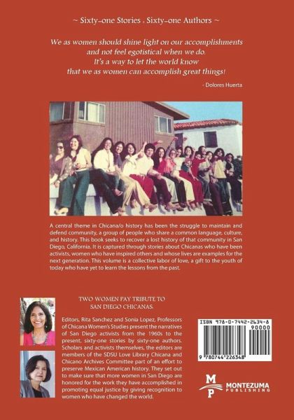 This book documents the experiences of sixty-one women who flourished in the ferment of the civil/ethnic/women’s rights movements of the late twentieth century and beyond. While each life is unique, collectively they demonstrate the benefits gained when a community and a society unleashes and fosters the potential of women who create, organize, and lead. Conversely, an undetermined degree of loss may accrue to societies that suppress or discourage the freedom of women to shape their destinies. When women come together with a collective intention, powerful things happen. Simultaneously, but separately, in 1972-73, at San Diego State University and at Stanford University, and having never met, two of us had the same idea, to propose and design a course about Mexican American women. The idea for this book also has a history. In those days, both of us wanted to contribute to the development of Chicano studies. The Mexican American voice, so much a fabric of U.S. history was missing from the dominant English narrative and the women’s presence was nearly absent from Chicano literature and history. Chicanas acted to change these injustices, thereby adding new energy to the Chicano Movement and to other liberation discourse. At that time, as graduate students, we had the opportunity to teach a Chicana women’s course. Such a course had never been taught at either university. While women instigated change at different colleges, in those years Chicanas/Latinas appeared to be anonymous. And although Anglo women around the country had already started addressing women’s needs, they did not include the new diverse student population that was entering the universities. the woman where she has most noticeably served. Chapters One and Two begin with Mujeres Presentes, that is, the women who have passed away but whose presence lives on as their actions continue to affect the lives of others. Chapters Eleven and Twelve highlight educators whose work builds on that of earlier mentors and their actions. The chapters between include: Three and Four, "Early Activists;" Five and Six, "Chicanas in the Arts:" Seven and Eight, "Chicanas in Education;" Nine and Ten, "Chicanas in Public Office." Each chapter includes a brief introduction, but the women’s narratives are the core of the book; their stories easily stand on their own. This collection may be considered a starting point and by no means represents the entire Chicana/Latina community in San Diego. As it turned out there were many more women than the sixty-one women presented here. The hope is that others may read the book and decide to author a future edition. All women ought to be honored for their efforts and receive the recognition they deserve.