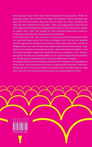 Diese gegensätzlichen Wahrnehmungen und politischen Debatten sind Ausgangspunkt dieser Studie, in der die Autorin Chick Flicks als popkulturelles Phänomen untersucht. Anstatt das Genre als gut oder schlecht zu bewerten, geht Sarah-Mai Dang der Frage nach, was Chick Flicks überhaupt sind und warum sie so gerne gesehen werden.