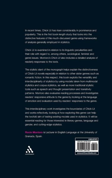 In recent times, Chick Lit has risen to a certain level of prominence. This is the first book length study that looks into the distinctive features of this much-discussed genre. Chick Lit is examined in relation to its linguistic peculiarities and their role as far as narrative, sociological and feminist issues are concerned, amongst others. Montoro's stylistics includes a cognitive slant that highlights further readerly aspects of the texts. The approach illuminates how the genre works, and how it is set apart from others. In this respect, the stylistics of chick lit is understood in its contect of production and reception. Montoro evaluates reading processes and investigates readers' responsive attitude to the genre. This interdisciplinary work explores the boundaries of the stylistics of chick lit and works reflectively, looking at how exploring this genre can help the twofold aim of testing existing models of linguistic and cognitive analysis. It will be essential reading for those interested in cutting-edge stylistics.