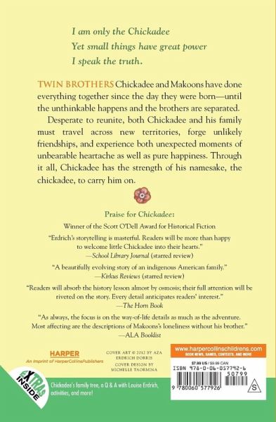 Winner of the Scott O'Dell Award for Historical Fiction, Chickadee is the first novel of a new arc in the critically acclaimed Birchbark House series by New York Times bestselling author Louise Erdrich. Twin brothers Chickadee and Makoons have done everything together since they were born--until the unthinkable happens and the brothers are separated. Desperate to reunite, both Chickadee and his family must travel across new territories, forge unlikely friendships, and experience unexpected moments of both unbearable heartache and pure joy. And through it all, Chickadee draws from the strength of his namesake, the chickadee, to carry him home. Chickadee continues the story of one Ojibwe family's journey through one hundred years in America. In a starred review, School Library Journal proclaimed, "Readers will be more than happy to welcome little Chickadee into their hearts." The paperback edition includes additional material, such as an interview with the author and activities.
